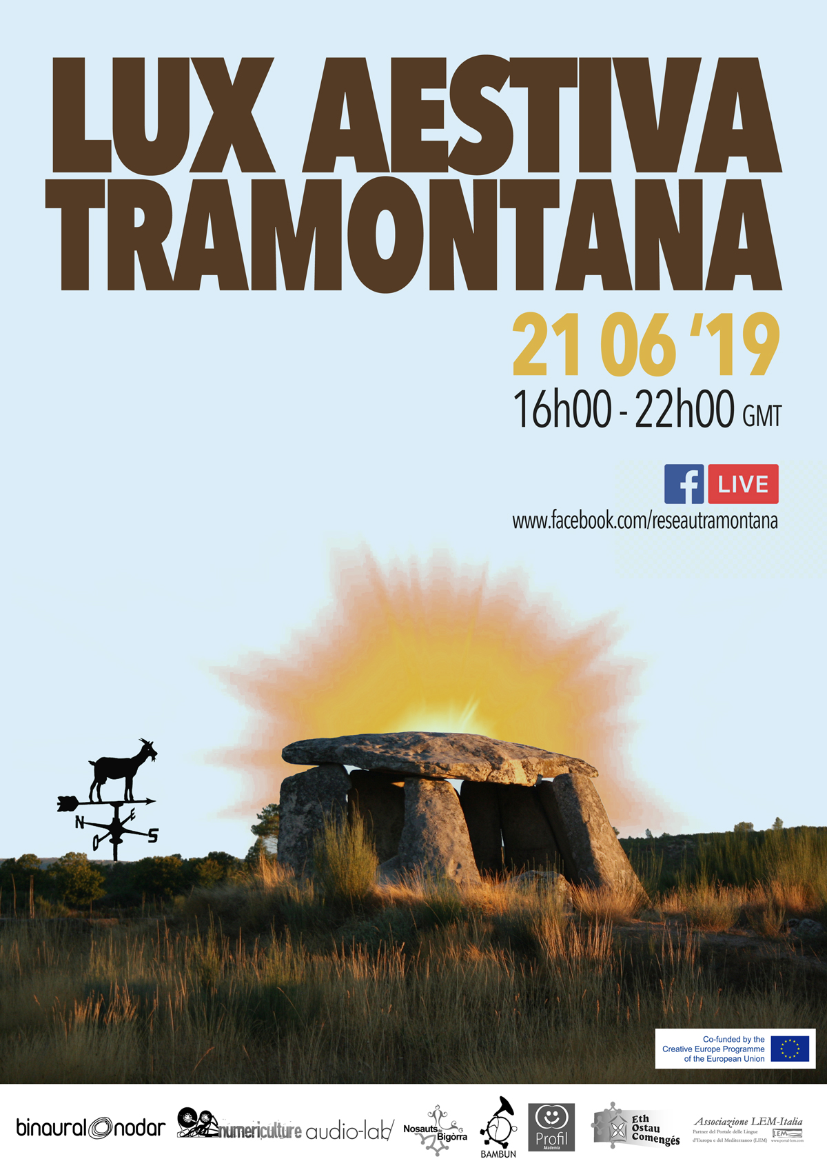 Lux Aestiva Tramontana, czyli transmisja online wybranych wydarzeń i nagrań zrealizowanych w ramach europejskiego projektu Tramontana III odbędzie się 21 czerwca 2019 w Internecie (www.facebook.com/reseautramontana) w godzinach 16-22. Zapraszamy do słuchania i oglądania.
