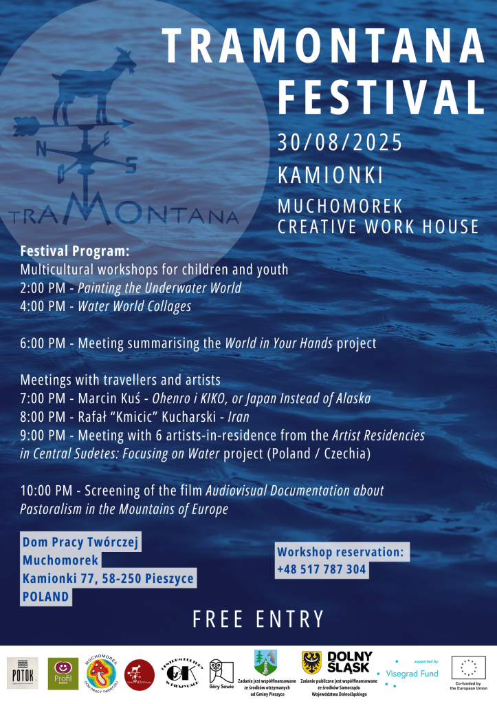 The programme also includes a meeting with artists-in-residence from Poland and the Czech Republic, who, during their creative stay at Muchomorek, are realising art projects inspired by the natural environment and local history of the Owl Mountains. In addition, participants will be invited to a screening of a documentary about pastoralism in the mountains of Europe – a story of people living close to nature, in tune with timeless traditions. This screening will include recordings from all Tramontana Network’s partners: Binaural Nodar (Portugal), Audiolab (Basque Country, Spain), Eth Ostau Comengés, Ràdio País & Numériculture Gascogne (Pyrenees, France), LEM-Italia, Bambun & La Leggera (Italy), GO2 Albania (Albania), ORMA (Romania) and Akademia Profil (Poland).